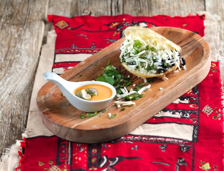 A flat masa cake filled with your choice of slow-braised chicken, slow-braised beef, vegan chorizo and cheese.