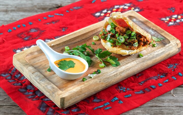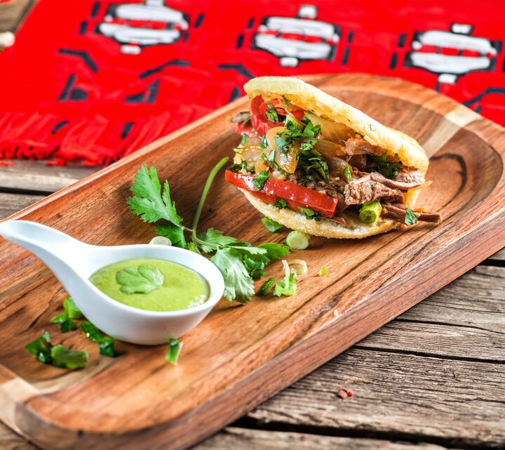 Savor the exquisite blend of seasoned beef and our signature corn cakes in our Beef Arepa, featuring a crispy exterior and a soft, fluffy interior.